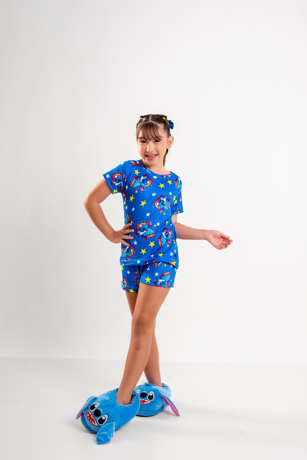 Baby-Doll Infantil Feminino Stitch Dormindo Azul